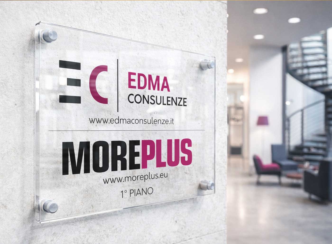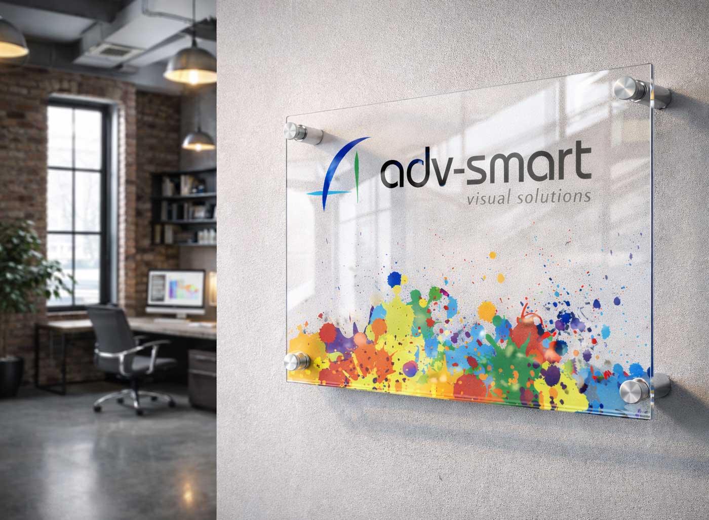 Targa in Plexiglass professionale pubblicitaria, realizzata in plexiglass di alta qualità del tipo colato con bordi lucidi e con stampa della grafica con bianco selettivo e fondo trasparente