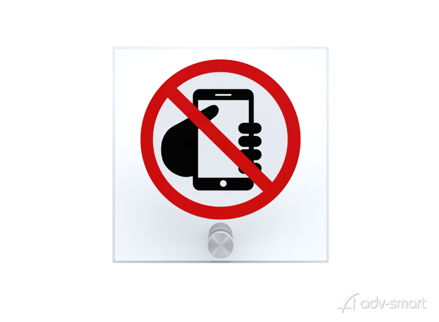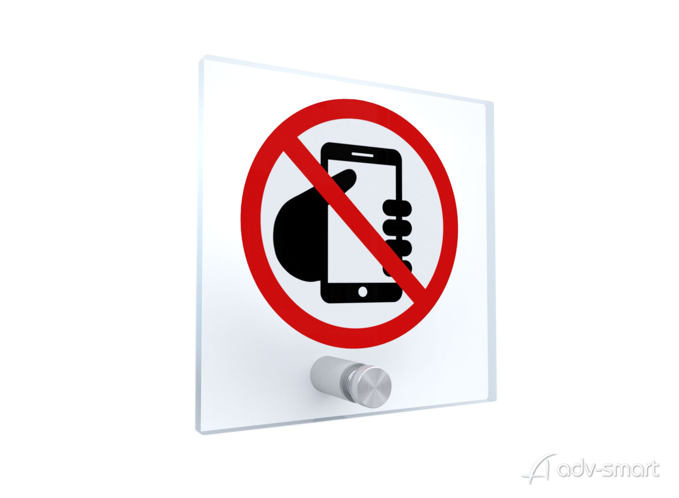 Targhetta Divieto Cellulare in Plexiglass realizzata con materiali di alta qualità, plexiglas di dimensioni 10×10 cm con spessore 5mm, del tipo colato con bordi lucidi, grafica stampata e fissaggio con distanziatore in acciaio inox.